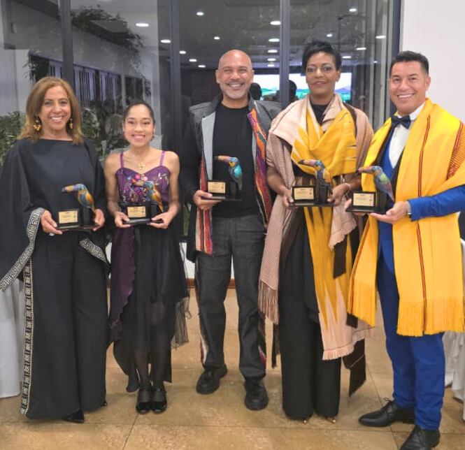 La estatuilla del premio representó un valor especial: una obra artesanal que rinde homenaje al Terlaque de Nariño (Andigena laminirostris), ave emblema del departamento. Diseñada por la maestra artesana Angélica Chiles Hidalgo, la pieza fue elaborada en madera de cedro y decorada con fibras vegetales mediante la técnica ancestral del enchapado en tamo, reflejando tradición, memoria y biodiversidad.